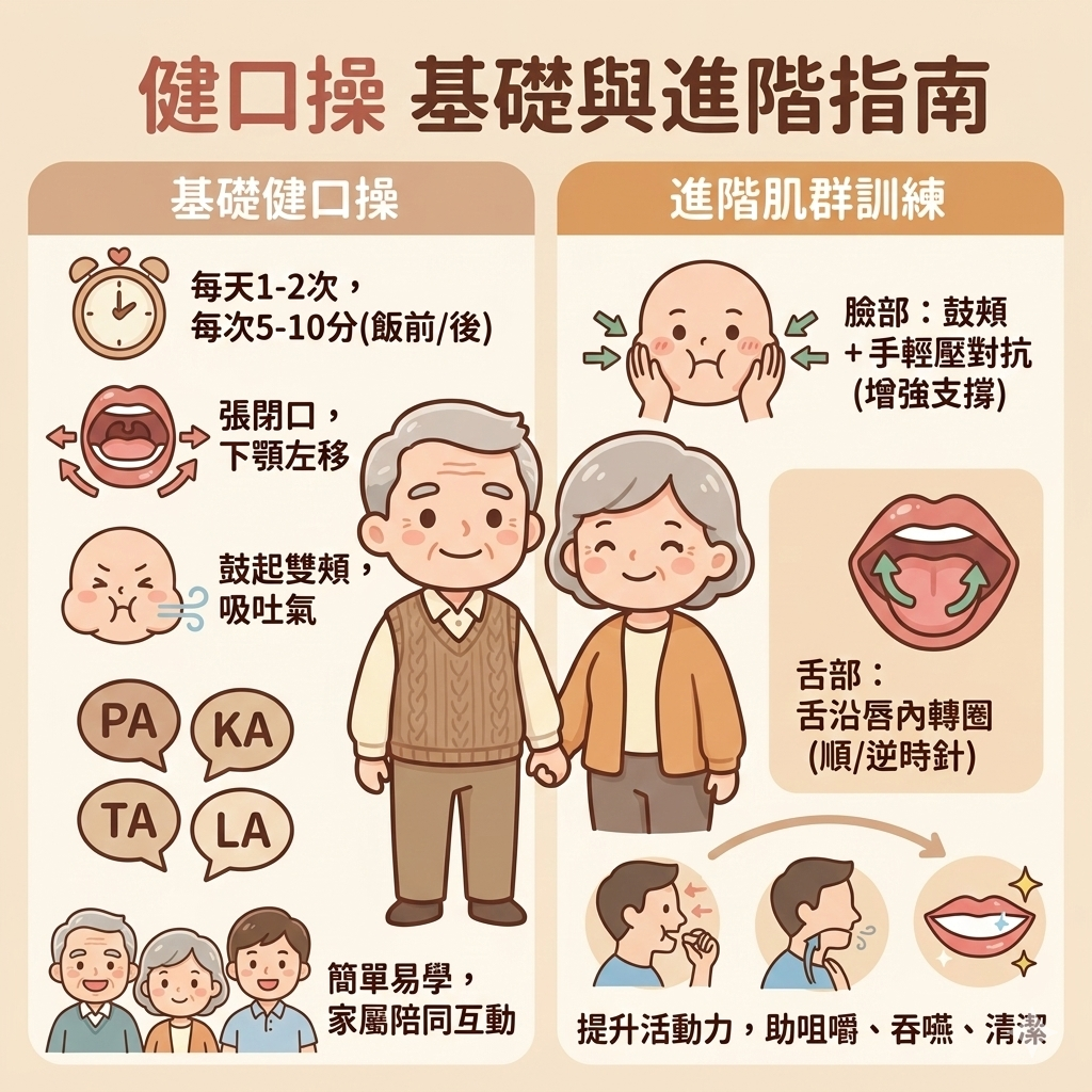 動作包含反覆張口、閉口、左右移動下顎,以訓練咬合與下顎的穩定度;再搭配鼓起雙頰、吸氣吐氣,以及「PA、KA、TA、LA」等發音練習,強化口唇與臉頰肌群。這些動作簡單易學,長輩在家就能自行操作,家屬若能陪同練習,也有助提升持續性與互動感。