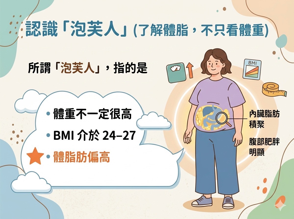 值得注意的是所謂的「泡芙人」族群——體重或BMI值介於24至27之間,看似不算肥胖,卻伴隨體脂肪偏高、內臟脂肪堆積與腹部肥胖等問題,實際上屬於代謝疾病高風險族群。