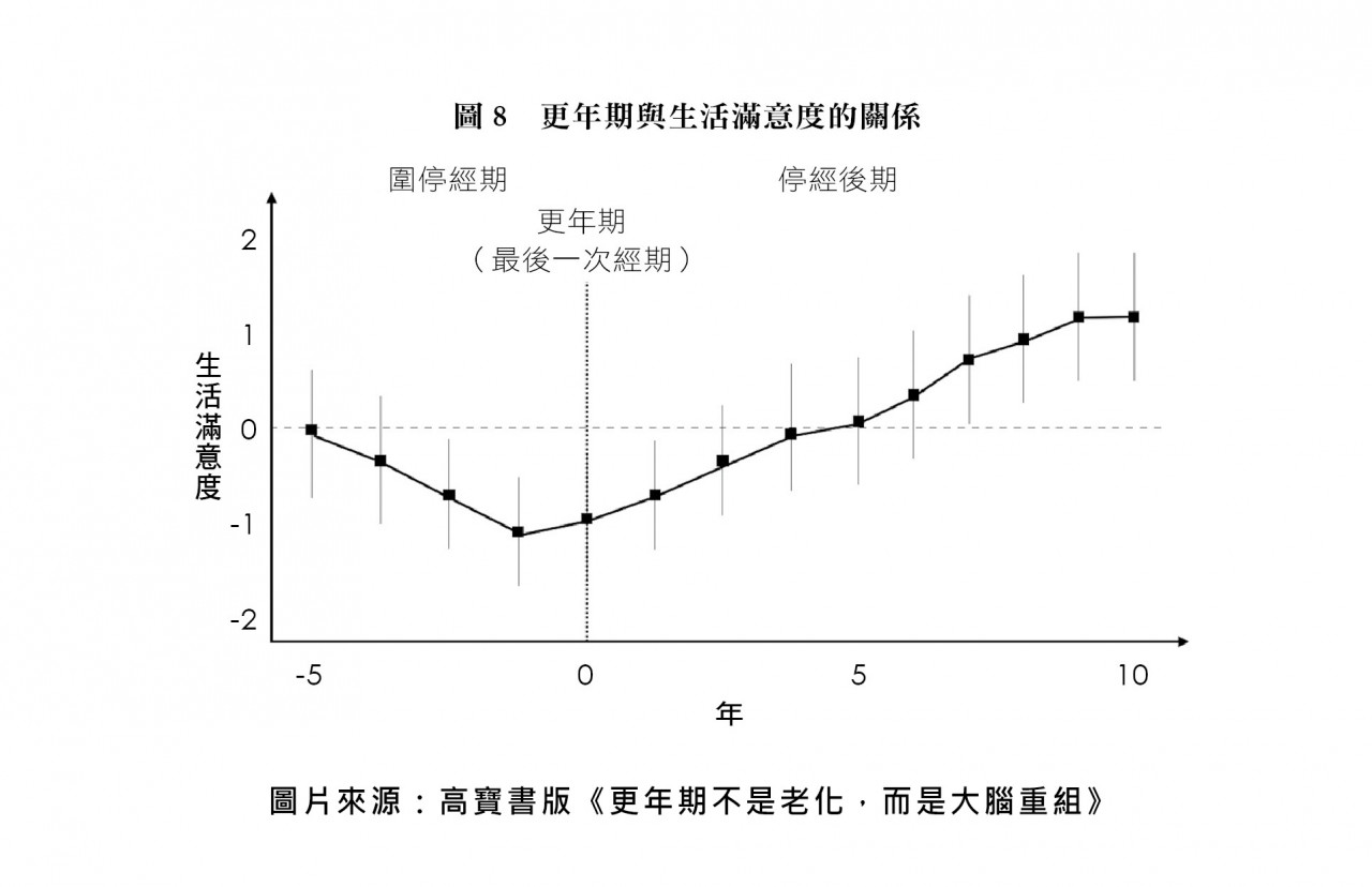 ● 更年期後:在最後一次月經後的2到3年內,生活滿意度通常仍然偏低,但隨後便超過基準線,並在之後維持穩定的提升。