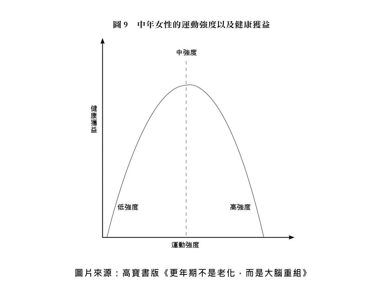 在中年時,運動強度與健康的關係呈現為「倒U形曲線」。低強度運動能帶來一些健康益處,但中等強度運動才是關鍵,能夠提供最大效益。而提高到高強度範圍後,益處不僅沒有顯著增加,甚至會呈現遞減趨勢。