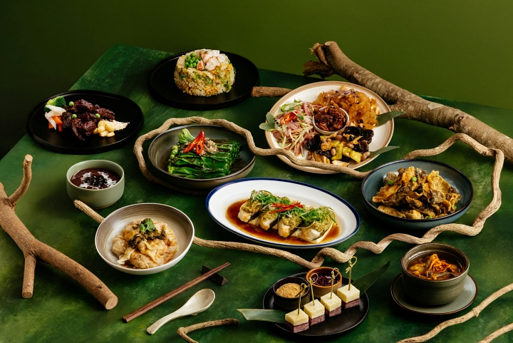 花蓮館以山海為軸,呈現食材最純粹的本味。「日式昆布湯」以昆布、柴魚與雞骨慢熬,湯體清澈鮮醇,襯托美國SRF極黑和牛的柔嫩肉香;「和風照燒山泉鱘龍魚」則將鱘龍魚炸至外酥內嫩,搭配柴魚話梅照燒醬與檸檬,鹹甘微酸、爽口開胃。四人分饗「黃金馬告牛骨湯」以牛骨與洋蔥熬出金黃湯底,融入馬告檸香;「麻油山泉鱘龍魚」以麻油與老薑襯托魚肉膠質,香氣溫潤。另以名店「花蓮香扁食」打造的「香辣野菜抄手」,薄皮包裹溫體豬肉餡,佐野菜與紅油醬汁;甜點「阿美族嘟論」出自「原香嘟論竹筒飯」,以純糯米製作,搭配花生粉或柚子醬,呈現傳統與創新的風味。