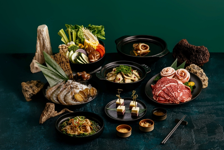 宜蘭館的冬日篇章從一碗湯開始。「雪濃牛骨湯」以牛骨慢熬至乳白濃醇,涮入美國SRF極黑和牛,暖意在舌尖緩緩展開;四人分饗的「人蔘御膳湯」則以人蔘、紅棗與雞骨高湯細火慢燉,清香回甘,讓和牛油脂更顯細膩。宜蘭地方滋味亦悄然入席——「林場肉羹」的大骨湯底化作「蘭陽肉羹韓式冬粉」,蒜香與筍絲清甜交融,黑豬肉羹與Q彈冬粉飽吸湯汁。甜點「桂花釀茶凍鹽滷豆花」選用名店「飛魚食染鹽滷豆花」,搭配金桔糖水與桂花茶凍,豆香、茶韻與花香層層交織,留下清雅餘韻。