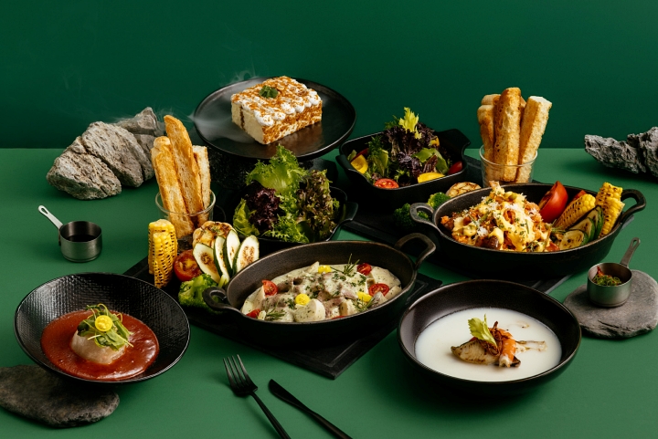 台南館以城市多元風味重新詮釋經典料理。「紅酒燉美國SRF極黑和牛佐奶香薯泥」以奶油洋蔥與紅酒慢燉,柔嫩和牛浸透微甜酒香,層次由柔滑轉為濃郁。雙人、四人分饗亦融入台南在地手路味——「地中海漁夫湯」以「陳家汕頭意麵」手工魚冊為底,搭上炙燒鱘龍魚玫瑰卷,再淋上龍蝦頭與蔬菜熬成的奶油濃湯,鮮香層層堆疊。飯後則以「修安扁擔豆花」延伸創意甜點「果漾粉粿義大利凍糕」,將洛神粉粿酸甜與巧克力凍糕苦香交織,為味旅畫下輕盈句點。