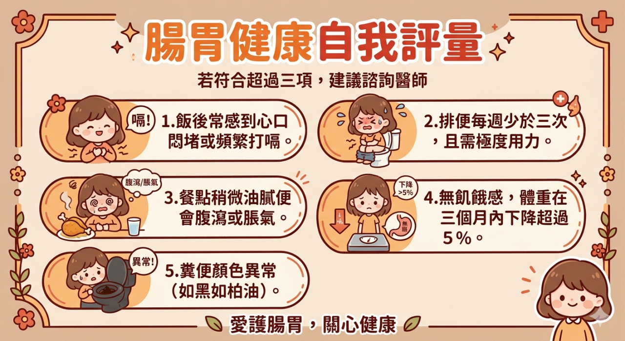 除了日常保養,也可以透過簡單觀察掌握腸胃狀況。例如是否經常飯後脹氣、打嗝,排便次數是否明顯減少,或進食稍油膩就出現不適;若伴隨食慾下降與體重減輕,更需提高警覺。若一週內出現3項(含)以上異常,建議及早諮詢醫師。