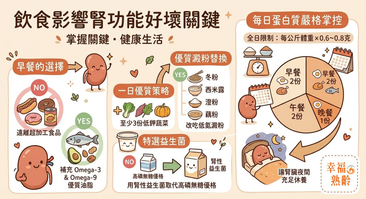 洪永祥建議對方,早餐應遠離超加工食品、補充 Omega-3與Omega-9優質油脂、至少攝取3份低鉀蔬菜,並用腎性益生菌取代高磷無糖優格,改吃低氮澱粉如冬粉、西米露、澄粉、藕粉等,也要嚴格掌控全日蛋白質攝取量,限制在每公斤體重乘以0.6至0.8克,早餐、午餐各攝取2份、晚餐減至1份,讓腎臟在夜間獲得充足的休養空間。