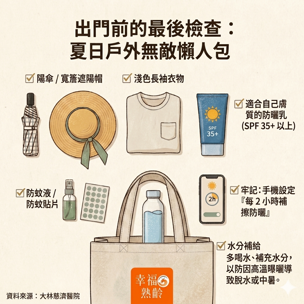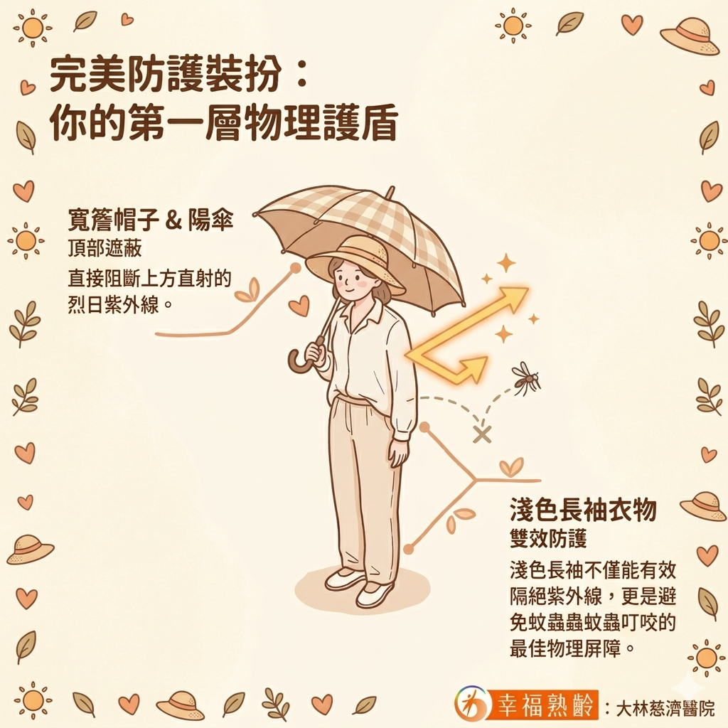 大林慈濟醫院皮膚科主任林騰立醫師指出,台灣夏季陽光強烈,若長時間曝曬,容易造成皮膚曬傷、色素沉澱,甚至增加皮膚老化與病變風險。他建議外出時應落實多重防護,包括配戴帽子、撐陽傘、穿著薄長袖與淺色衣物,並搭配防曬乳使用,形成完整防護網,同時也能降低蚊蟲叮咬機會。