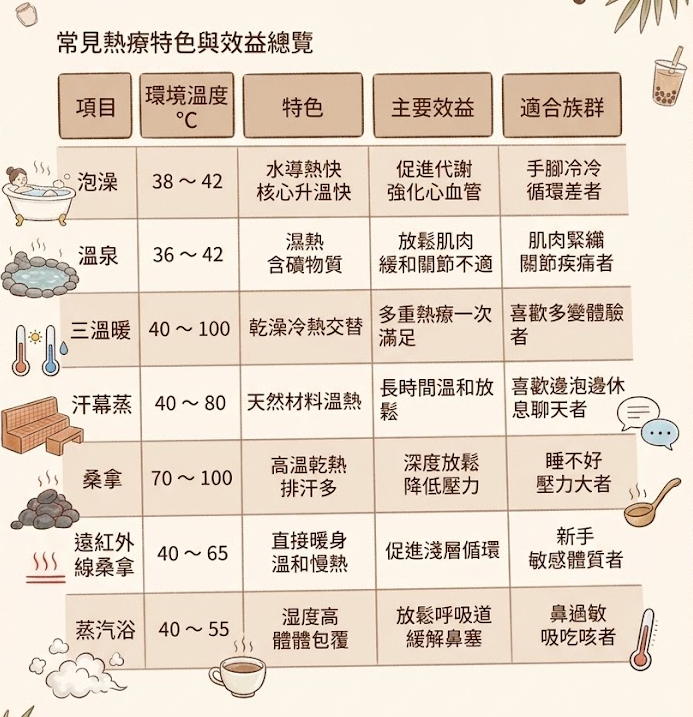 簡單來說,想促進代謝、加強修復,泡澡是最佳選擇;想放鬆情緒、改善睡眠,可試試桑拿;若體質敏感,從遠紅外線開始較容易持續。