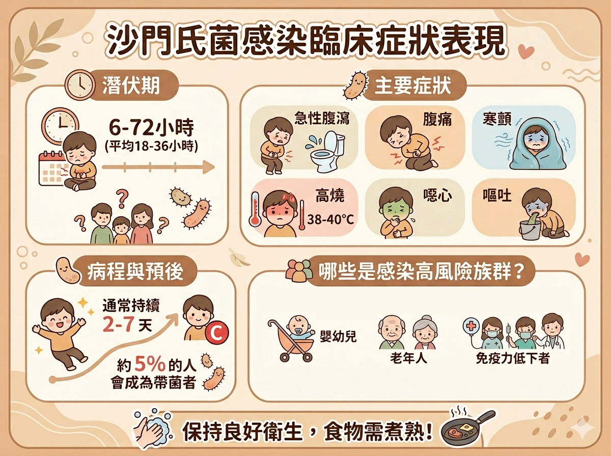 阮綜合醫院消化內科預防保健科主任蕭偉成醫師表示,感染沙門氏菌後約 6至72小時會出現噁心、嘔吐、腹瀉、腹痛及發燒等急性腸胃炎的症狀,通常是因為吃到受污染的生肉、蛋類、乳製品或未煮熟食物所導致。