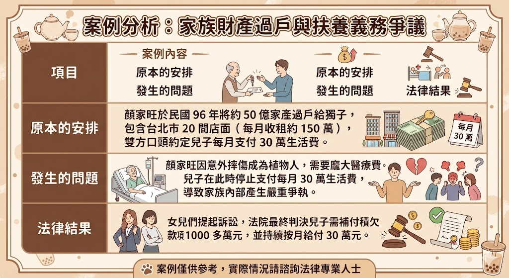台灣知名的顏家旺家族爭產事件,是「法律權利與現實落差」的典型案例。顏家旺先生曾任松山慈祐宮董事長,他對獨子的栽培與信任,卻在晚年因失能而面臨考驗。