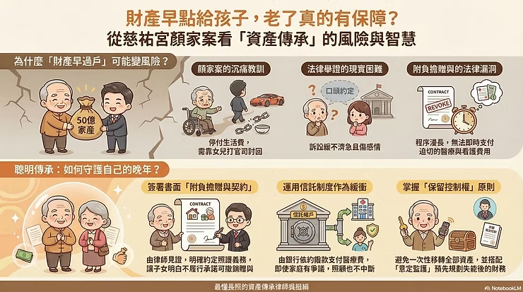 財產傳承不只是單純的產權轉移,更是一門「保留控制權」的藝術。養兒防老的觀念在現代已不足夠,真正成熟的傳承,是透過嚴謹的制度設計,讓您的財產在未來仍能按照您的意願,為您提供遮風避雨的保障。