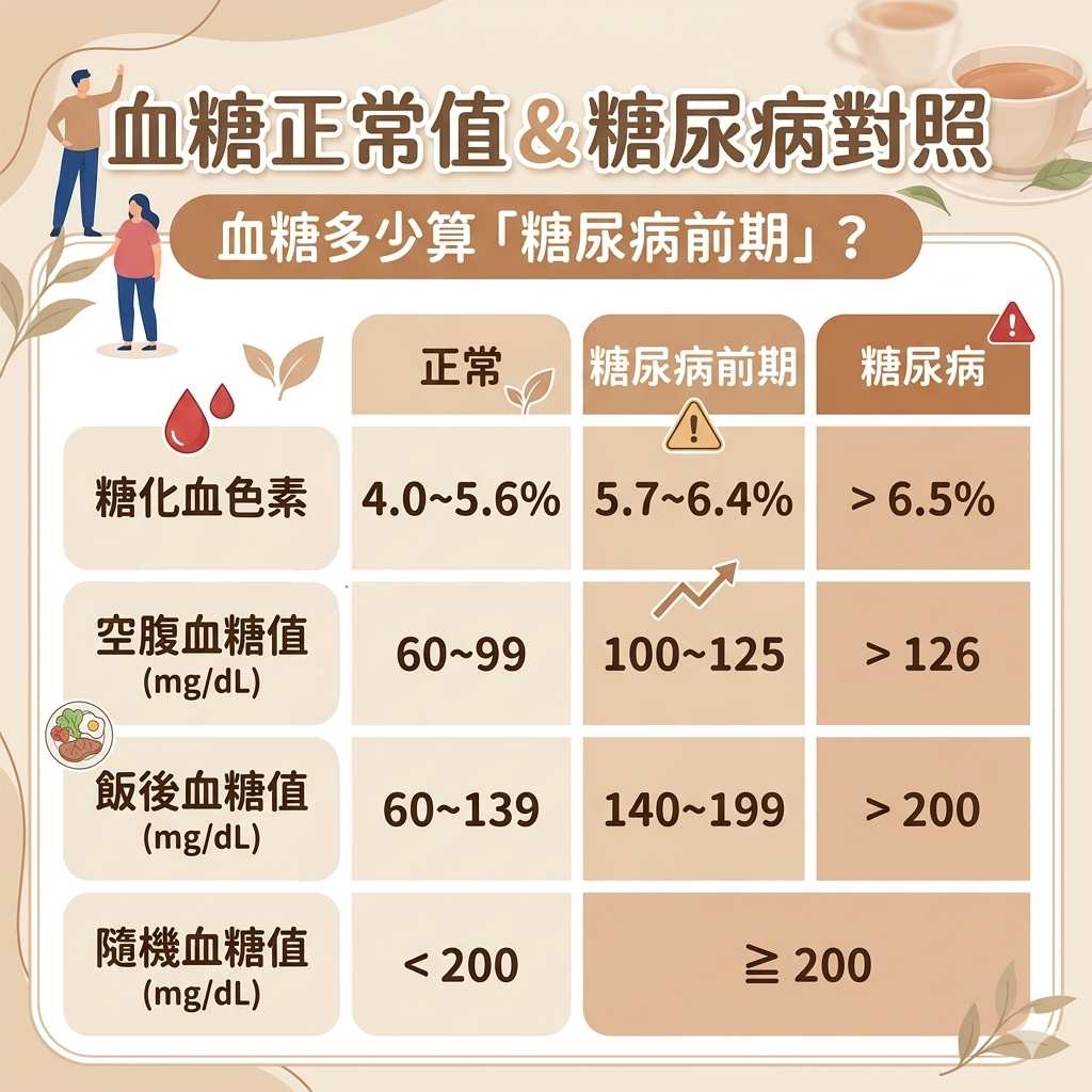糖化血色素的正常值在4.0%至5.6%,若是5.7%至6.4%則有罹患糖尿病風險,而高於6.5%就是糖尿病。另外,正常空腹血糖(AC)小於100 mg/dL,超過126 mg/dL為糖尿病。
