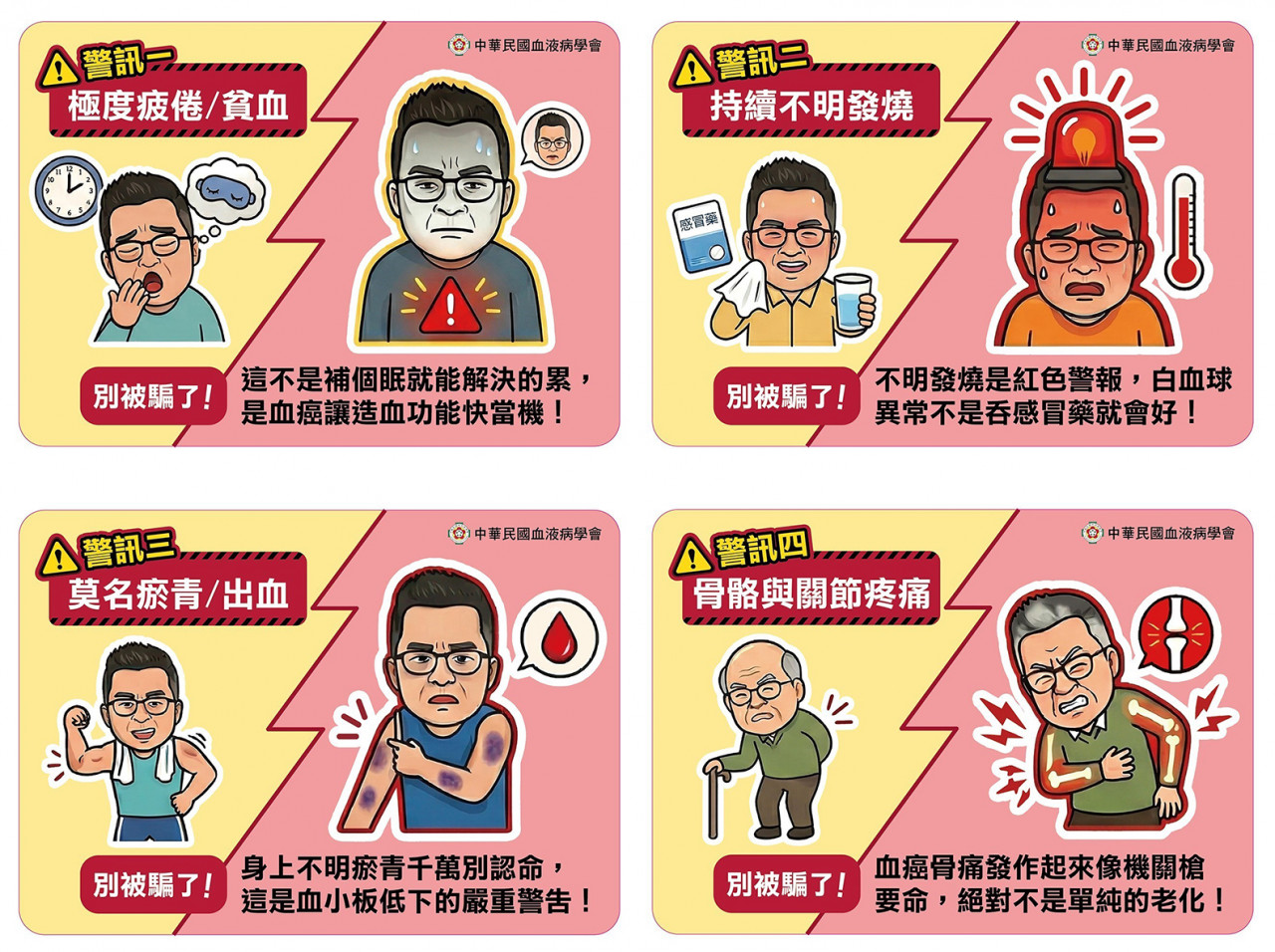 臺大醫院血液腫瘤科教授侯信安提醒,臨床上每個人的表現不一樣,但如果出現不明「反覆發燒」,或伴隨「極度疲倦、活動會喘」、「不明出血或瘀青」及「骨骼疼痛」等4大警訊,特別是同時中2個以上,最好找血液腫瘤科或家醫科就醫,進一步釐清是否為骨髓功能異常,切勿自行當醫生、錯失黃金治療期。