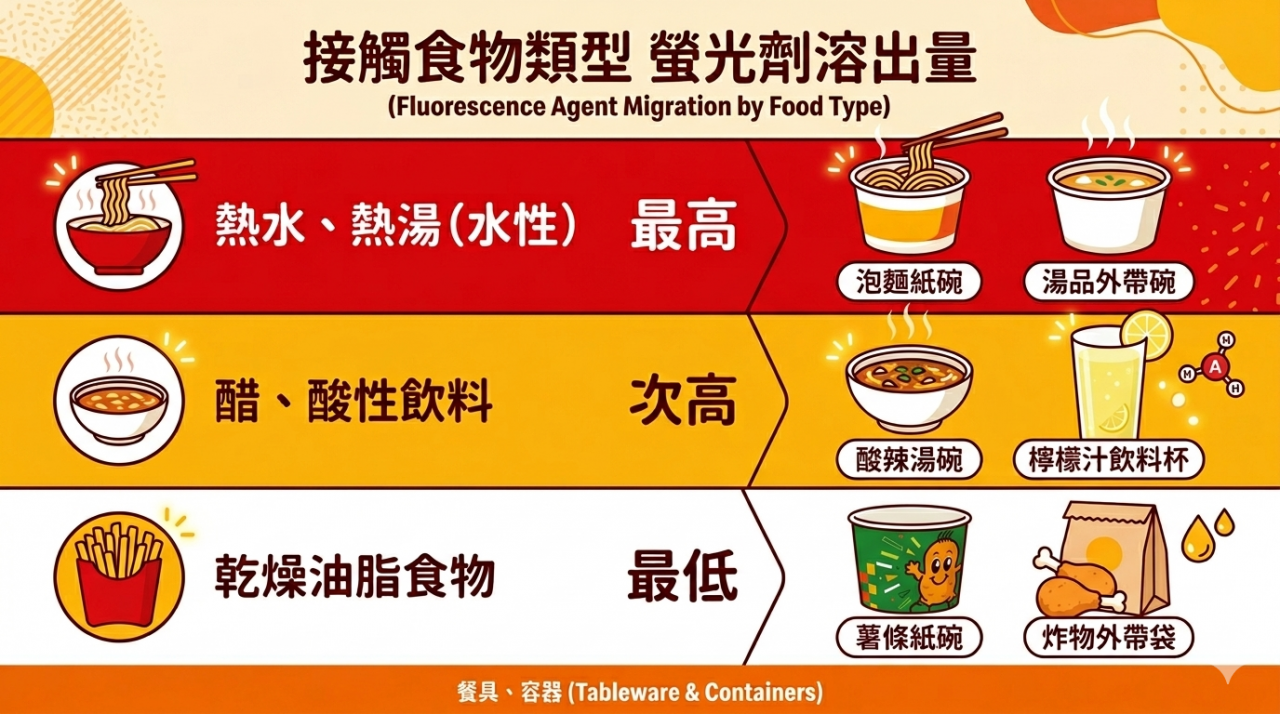 ▲食物性質:含水、酸性食物讓親水性螢光劑更容易溶出;油脂反而比較不容易帶走螢光劑。
