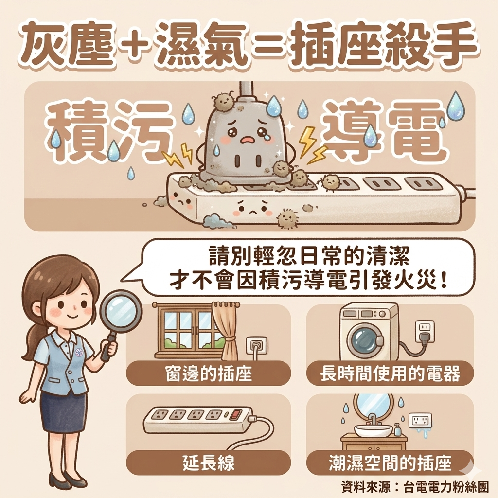 不只梅雨季,平時也要留意,長期有水氣又有不少高瓦數電器,三不五時就該看看插座周圍。