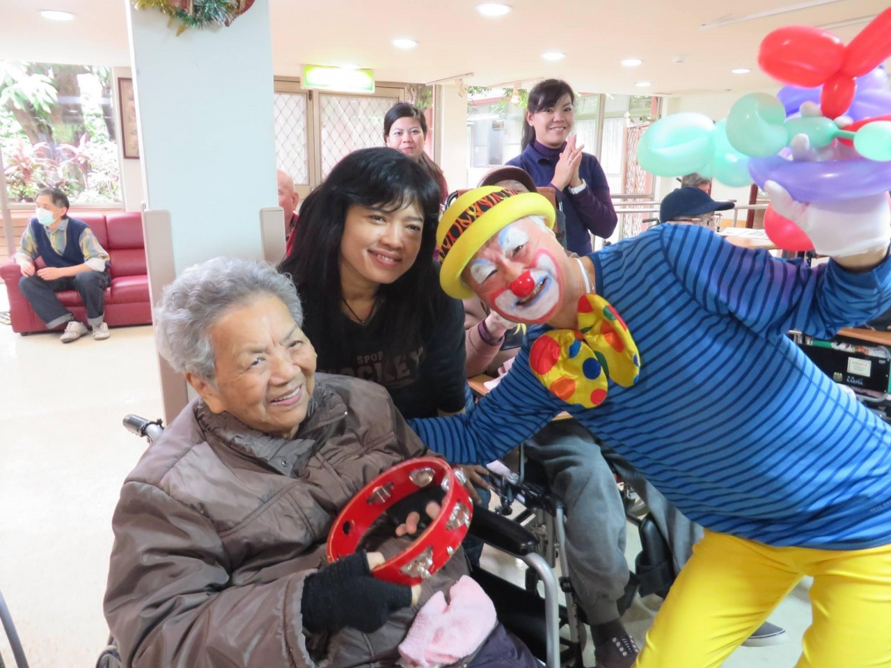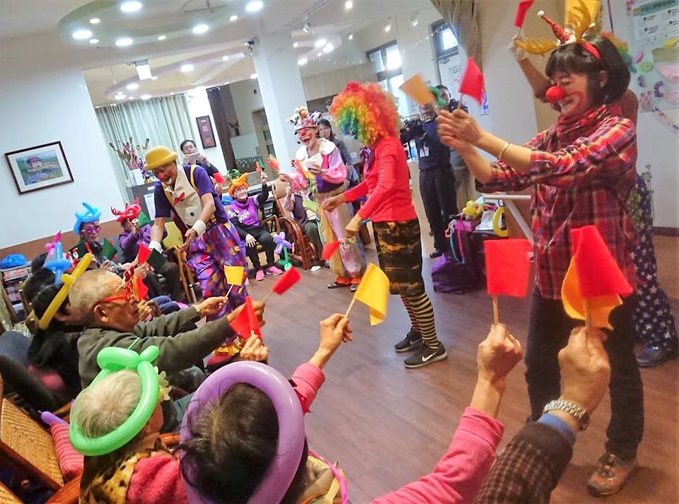 (圖/黃世岱與關懷小丑協會的志工,定期到台灣各地的長照中心與安養中心表演,帶給長輩們歡笑。 黃世岱提供)
